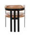 The Modrest Hazen Modern Camel Leather + Black Iron Dining Chair combines elegance and comfort. Upholstered in genuine camel chaps-saddle leather, it features a sturdy black iron frame and a slatted backrest. Ideal for contemporary dining spaces, this chair offers both style and durability.