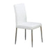 This dining side chair balances clean lines and cushioned comfort with modern simplicity. Horizontal channel tufting adds subtle dimension across the upholstered backrest, while smooth faux leather offers easy-care appeal. Supported by round tapered metal legs in a polished chrome finish, the frame adds a sleek contrast. Perfect for modern dining areas, this chair blends minimalism with everyday function.