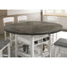 STACIE Counter Ht. Round Dining Table, 60"DIA X 36 1/8"H, 210lbs. This four-sided drop-leaf dining table collapses easily for space efficiency and offers even further convenience with various storage features and a tabletop lazy susan, which is also included. Six matching chairs, sold separately, complete this ensemble.