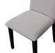 Matching chairs are upholstered in boucle fabric in beige, its softness and texture emphasizing the sharp angles of the back. The table and chair work in tandem to create a uniquely striking silhouette.