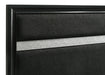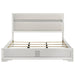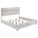 Introduce a little bit of glam flair to your bedroom with a modern upholstered bed. Featuring padded white fabric panels, the headboard is complete with molded trim and a horizontal stripe that glitters in the light. A matching vertical stripe on the low footboard is the perfect complement. A white finish is lightly textured on the panel footboard and rails, while trim is smooth and cool. The bed is complete with slats and center legs for added support and requires a foundation.